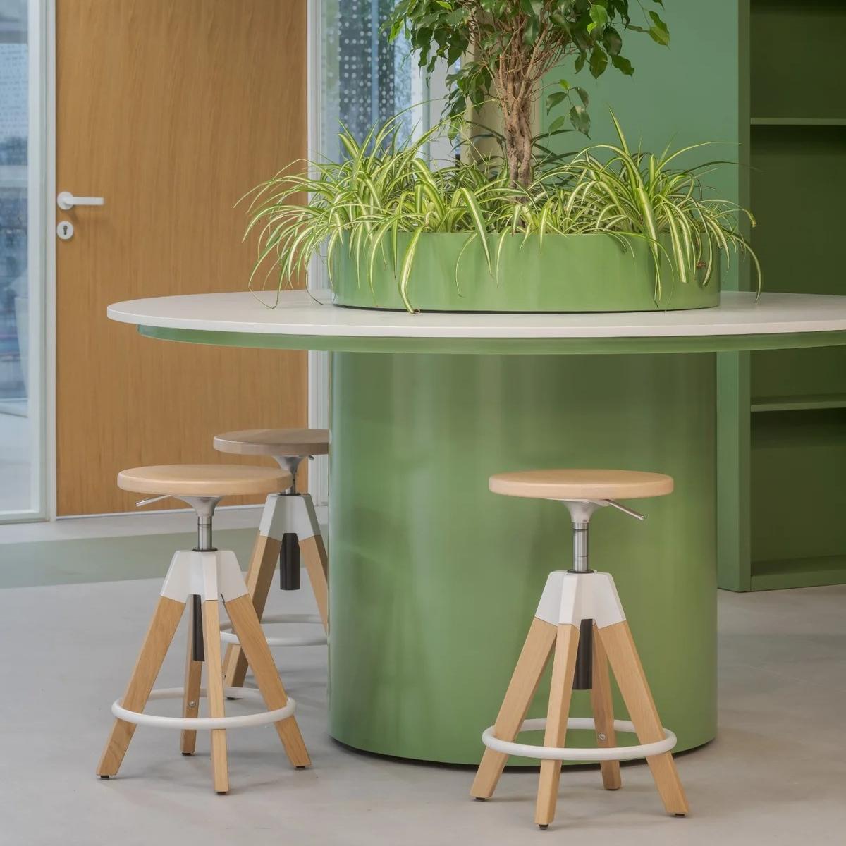 Spaja industrijski izgled i funkcionalnost. Njeno sedište i noge su od punog hrasta, okretna je i poseduje gas lift mehanizam, za laku promenu visine. Kao kontrast drvetu, oslonac za stopala izrađen je od čelika...